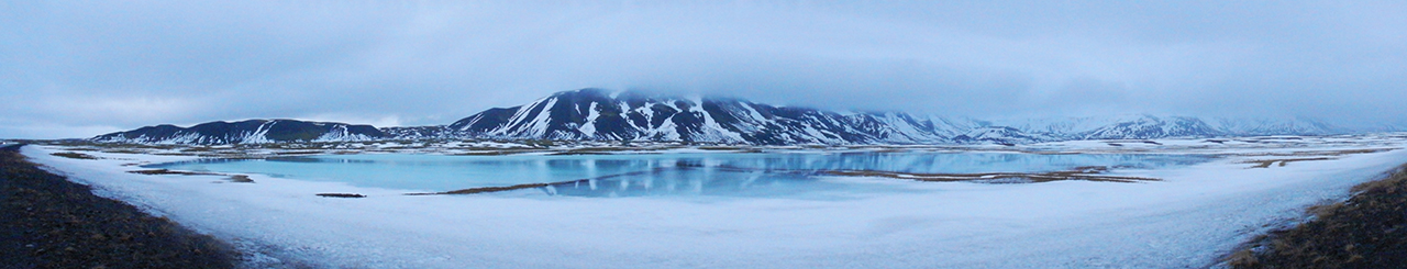 The glass lakes were on a very long, empty road, with no place to park. We found a little bit of a turn off, where it looked like it was a 3-5 minute walk to take pictures. However the size of the landscape was deceiving. It took us over 20 minutes to walk down the roadway to where the lakes of ice were. Our car looked like a tiny speck, so far away. As we reached the lakes, I looked upon one of the most beautiful places I have ever seen in my life, everything about this landscape was from a fairy tale. Low clouds hung to the tops of the mountains, snow scattered across the earth in every direction, small tufts of green and yellow grasses poked out from the snow, but it was the mirror lakes that were the most amazing. The blue of the ice water shining from below, the pink of the sky shining from above, and the mountains, earth, and snow all melting together and reflecting back at one another.